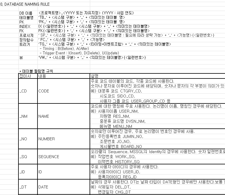 프로그램 개발을 하다 보면 변수들에 대한 규칙을 따라 개발 하다 보면, 변수명이 개떡같아도 최소한 어디에 쓰이는지는 유추 해 볼 수 있다. 데이터베이스도 마찬가지, 몇 가지 룰을 정해서 테이블이든 컬럼이든 명칭을 지정해서 만들다 보면 최악의 경우 데이터베이스 명세가 없어도 명칭과 데이터를 보고 대충 유추해 볼 수도 있다. 왠만하면 미운거 아님 명세서라도 남겨..줘..